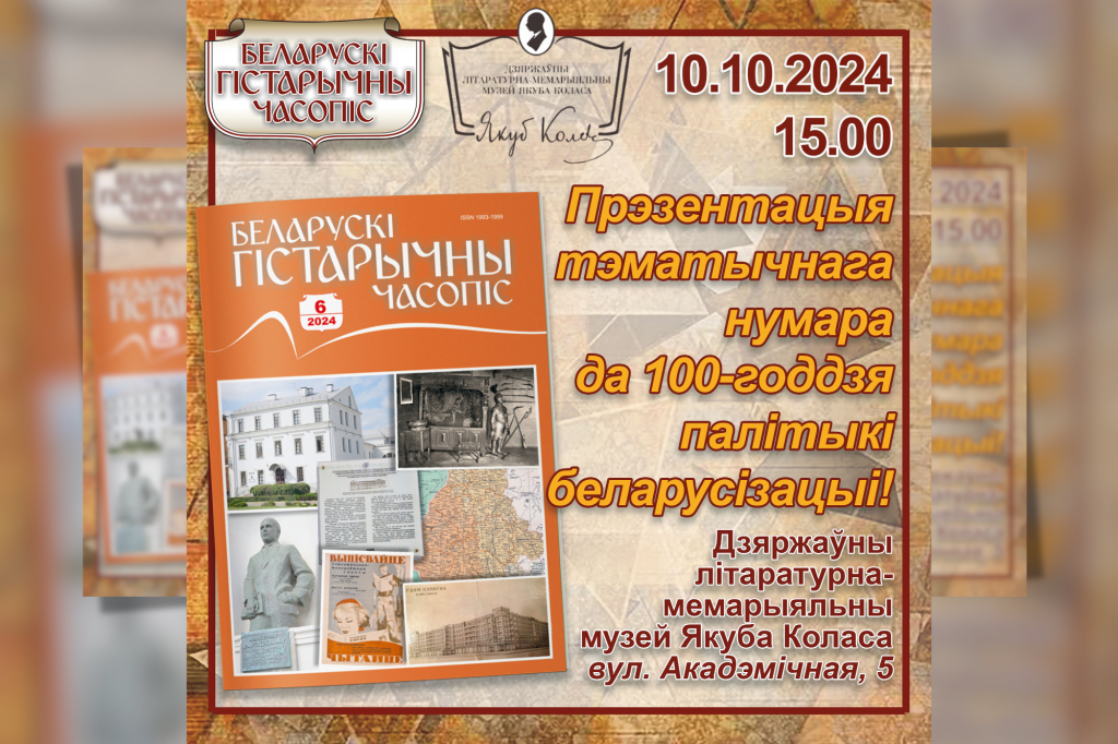 10 кастрычніка 2024 г. ў Дзяржаўным літаратурна-мемарыяльным музеі Якуба Коласа (вул. Акадэмічная, 5) адбудзецца прэзентацыя тэматычнага нумара навукова-тэарэтычнага, навукова-метадычнага часопіса “Беларускі гістарычны часопіс”, прысвечанага 100-годдзю палітыкі беларусізацыі.