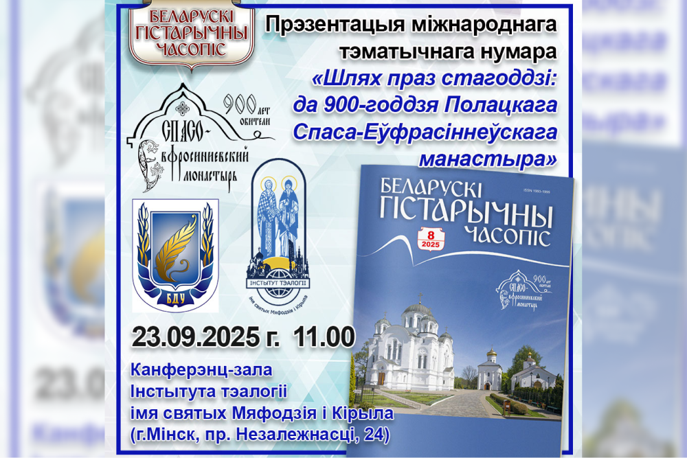 23 верасня ў канферэнц-зале Інстытута тэалогіі імя святых Мяфодзія і Кірылы адбудзецца прэзентацыя міжнароднага тэматычнага нумара “Шлях праз стагоддзі: да 900-годдзя Полацкага Спаса-Еўфрасіннеўскага манастыра” навукова-метадычнага часопіса “Беларускі гістарычны часопіс”.