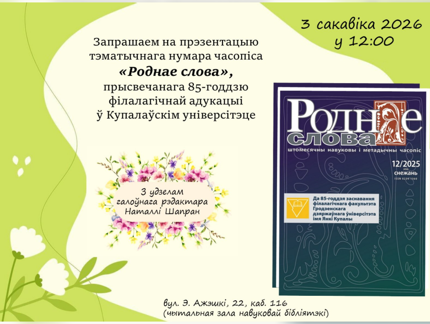 З удзелам галоўнага рэдактара Наталлі Шапран. Дата: 3 сакавіка 2026 г у 12:00 Месца: вул. Э. Ажэшкі, 22, каб. 116 (чытальная зала навуковай бібліятэкі)