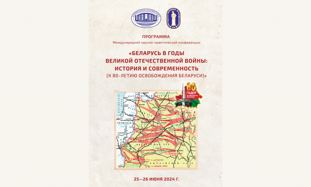 25–26 июня 2024 г. в Национальной академии наук Беларуси состоялась Международная научно-практическая конференция «Беларусь в годы Великой Отечественной войны: история и современность (к 80-летию освобождения Беларуси)». Форум работал в Президиуме НАН Беларуси, Институте истории и Центральной научной библиотеке имени Якуба Коласа.