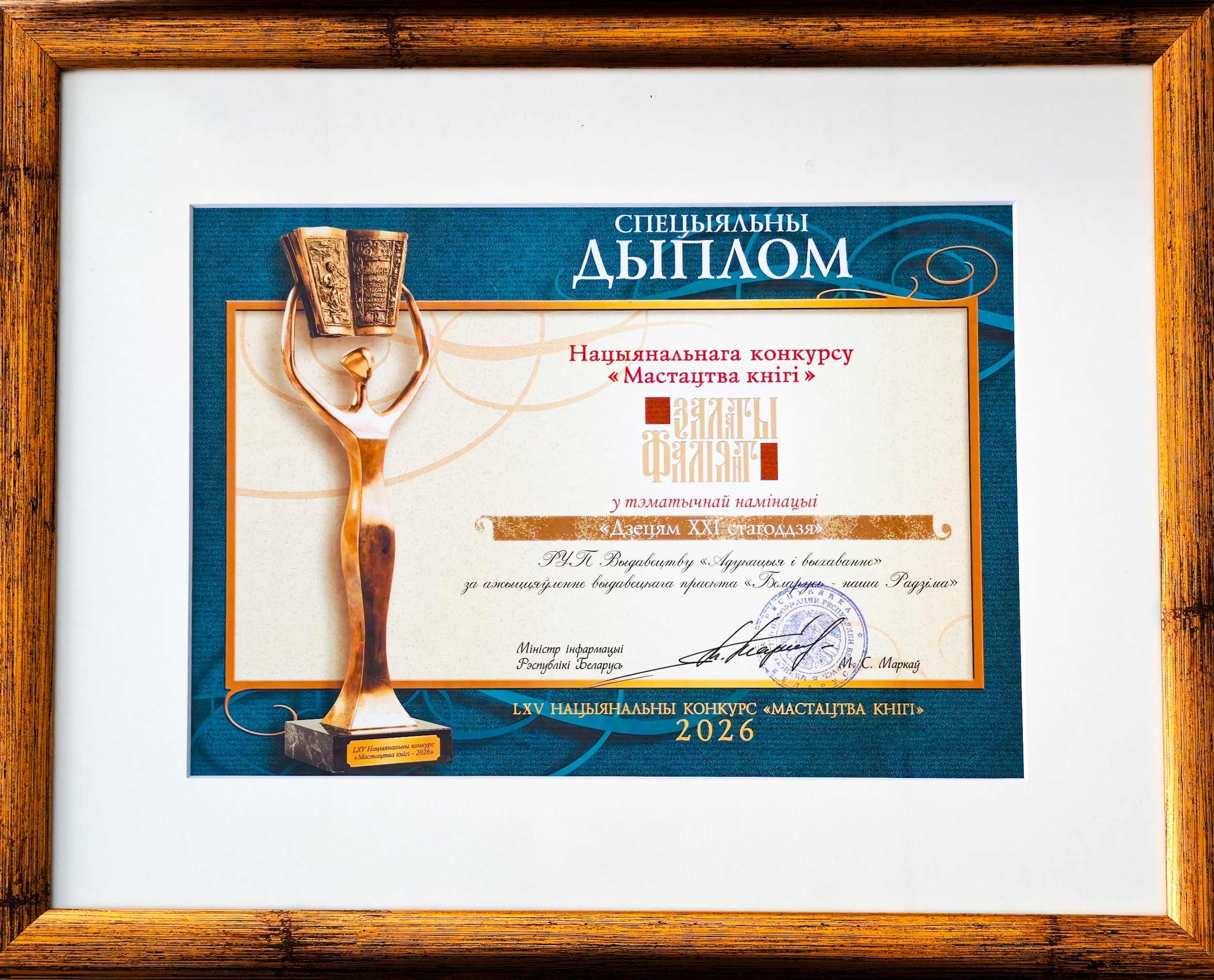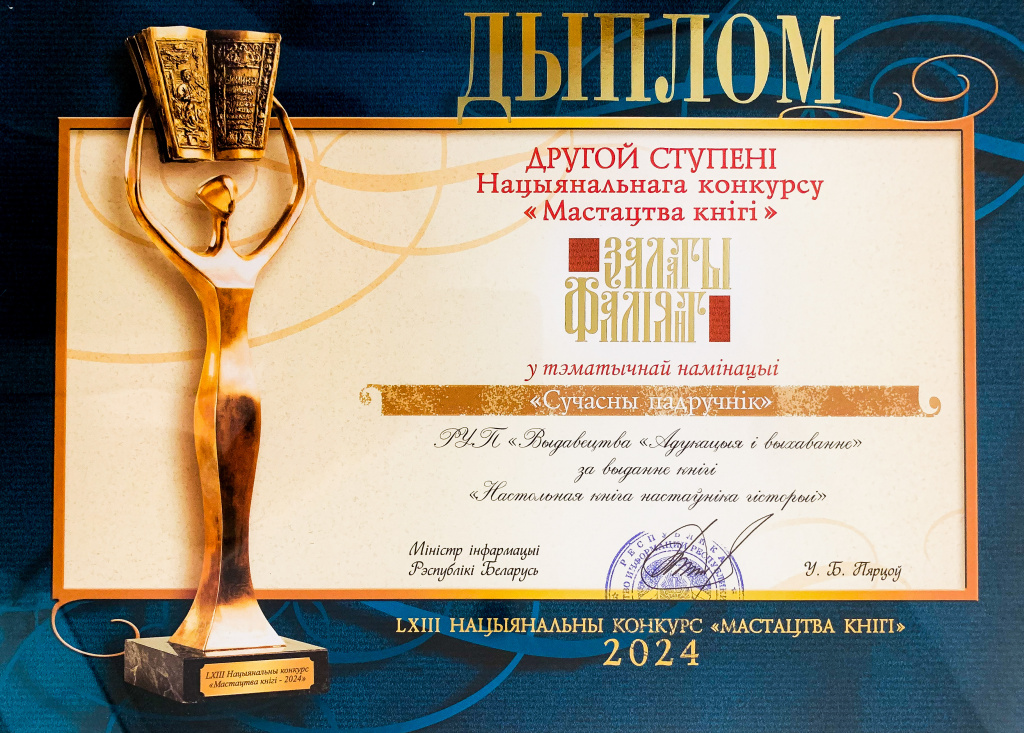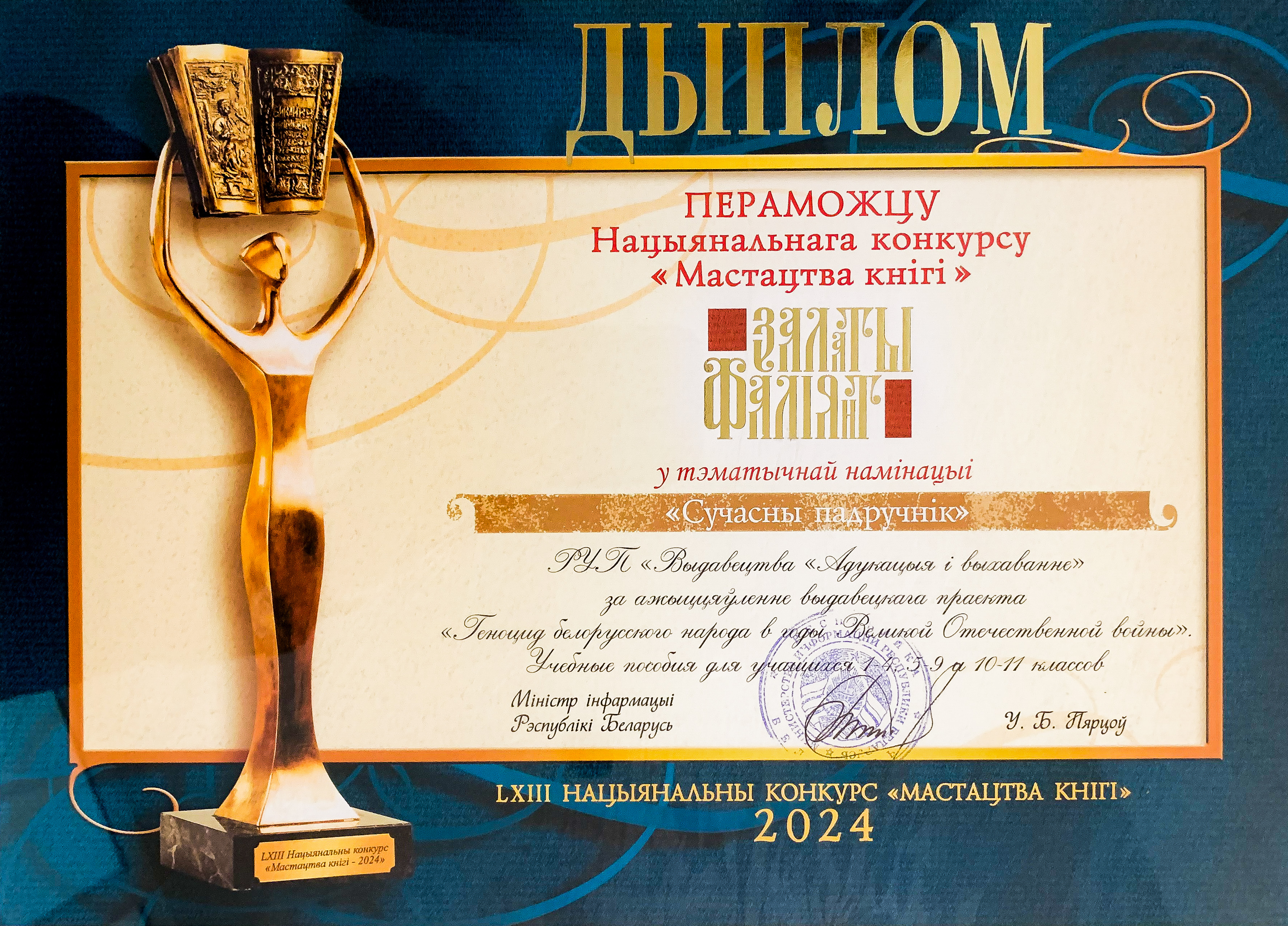 Диплом победителя LXIII Национального конкурса «Мастацтва кнігі» 2024 в номинации «Сучасны падручнік» издательство получило за комплект учебных пособий «Геноцид белорусского народа в годы Великой Отечественной войны» (для 1–4, 5–9 и 10–11 классов, авторы: В. В. Толкачёв, В. А. Финевич, В. В. Таратынко и др.).