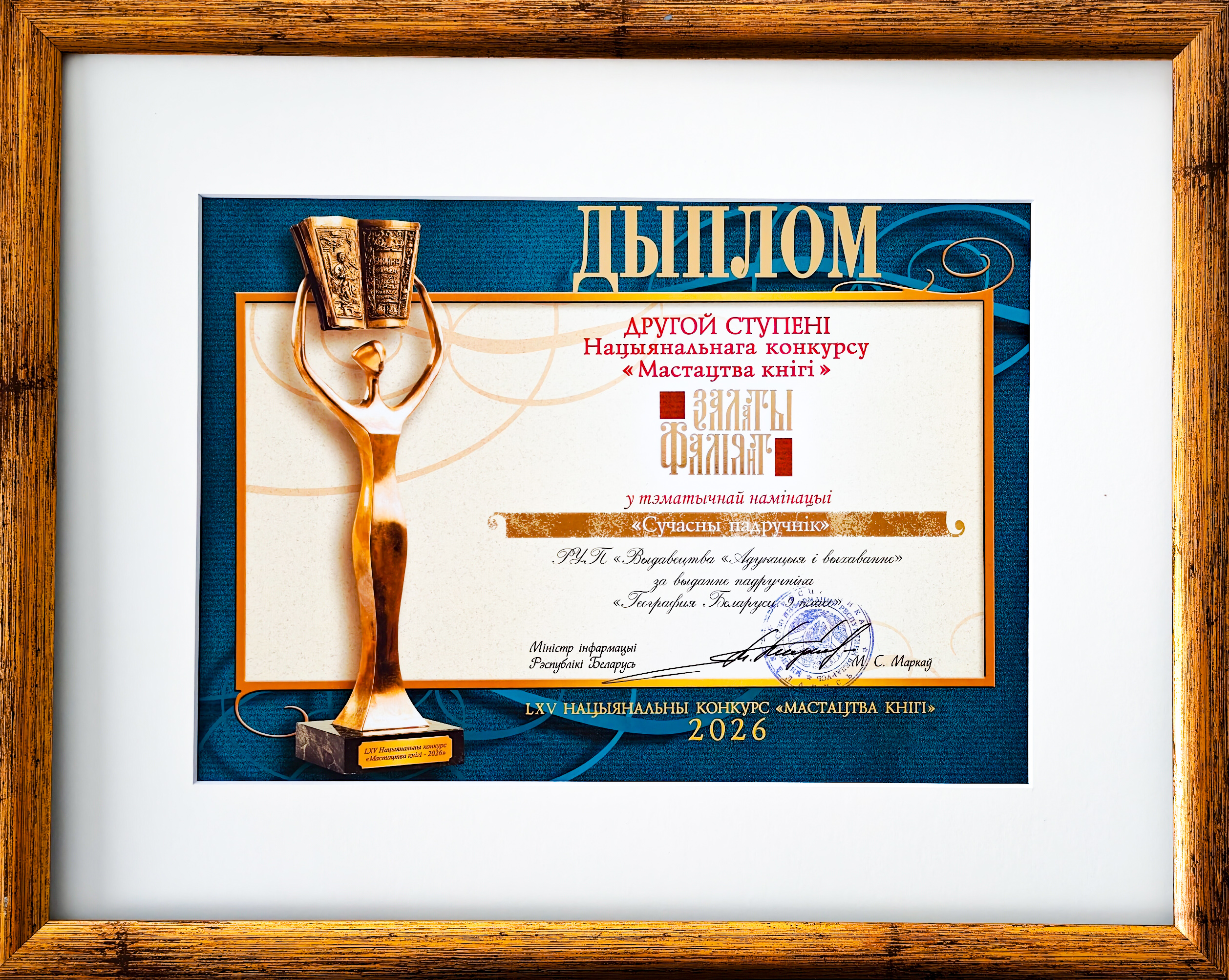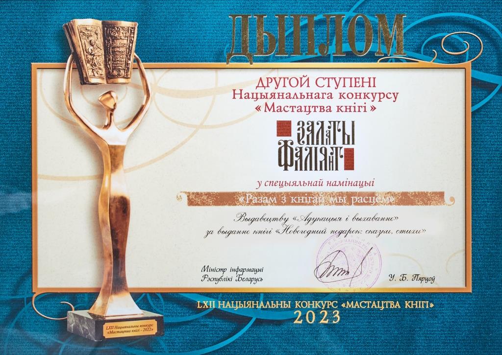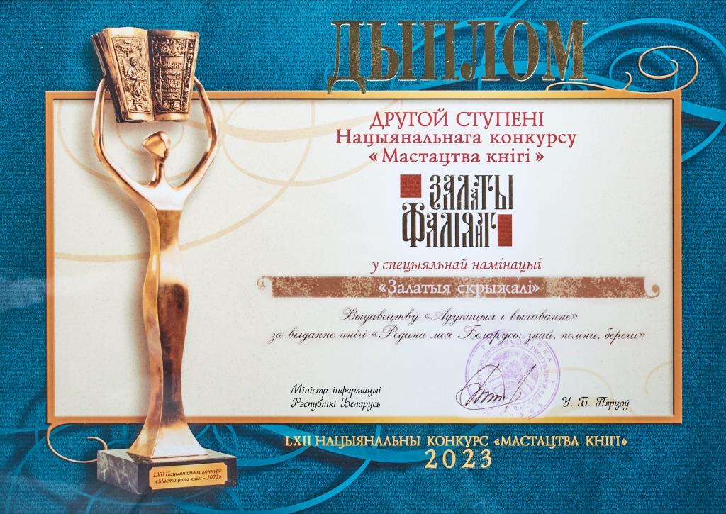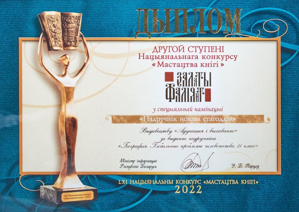 Диплом победителя LXIII Национального конкурса «Мастацтва кнігі» 2024 в номинации «Сучасны падручнік» издательство получило за комплект учебных пособий «Геноцид белорусского народа в годы Великой Отечественной войны» (для 1–4, 5–9 и 10–11 классов, авторы: В. В. Толкачёв, В. А. Финевич, В. В. Таратынко и др.).