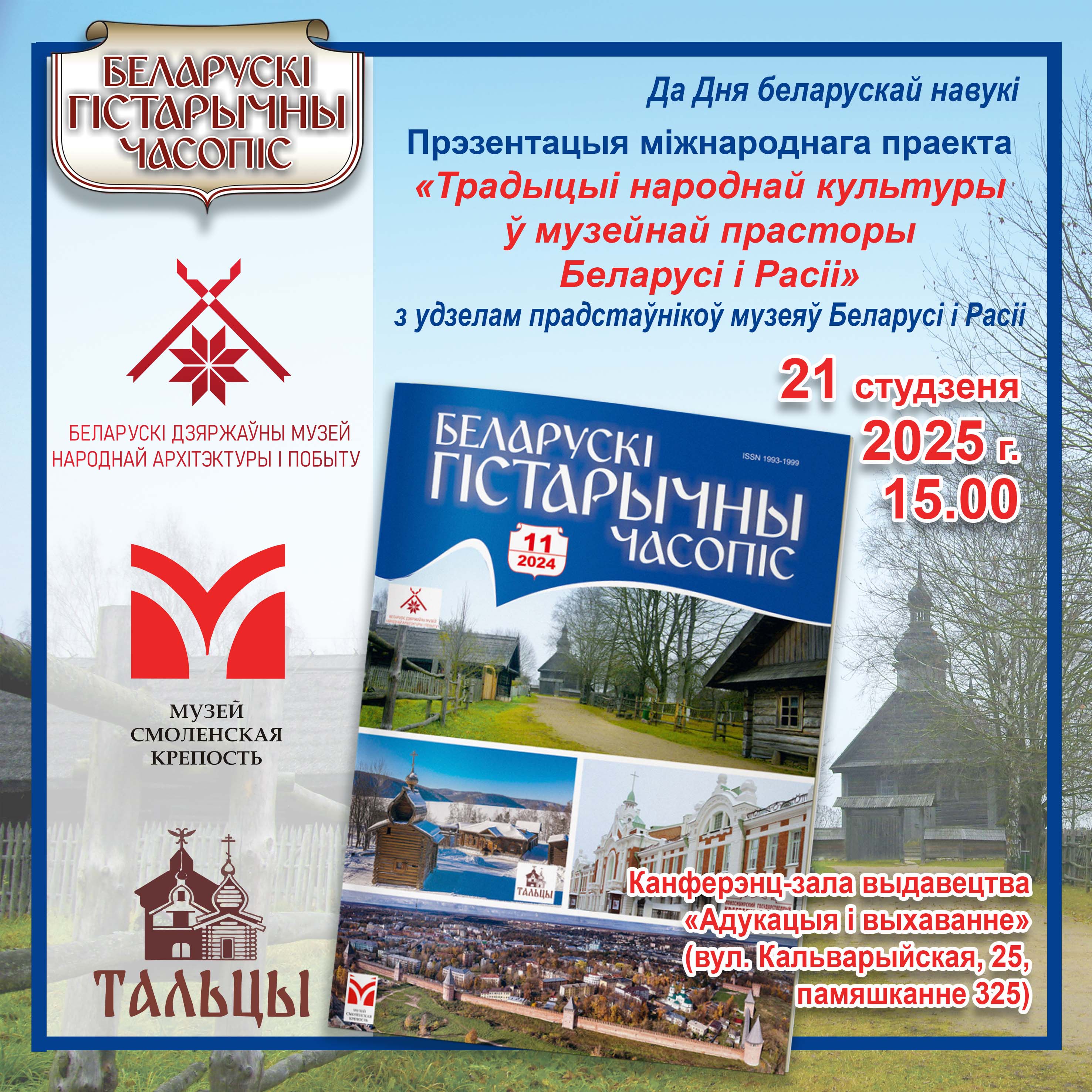 21 студзеня 2025 г. у Беларускім дзяржаўным музеі народнай архітэктуры і побыту адбудзецца прэзентацыя № 11/2024 “Беларускага культуры, папулярызацыі гісторыка-этнаграфічнай спадчыны ў музейнай прасторы Беларусі і Расіі. У творчай атмасферы наведвальнікі мерапрыемсва пачуюць выступленні кіраўнікоў беларускага музея (Э.А.Багдановіч) і яго міжнародных партнёраў з Смаленска і Іркуцка (С.А.Піляк і У.В.Ціханаў), а таксама паведамленні аўтараў артыкулаў па азначанай праблематыцы.