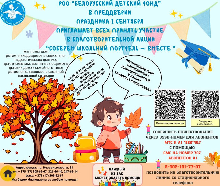 В преддверии этого праздника Белорусский детский фонд приглашает всех принять участие в благотворительной акции «Соберем школьный портфель – вместе».