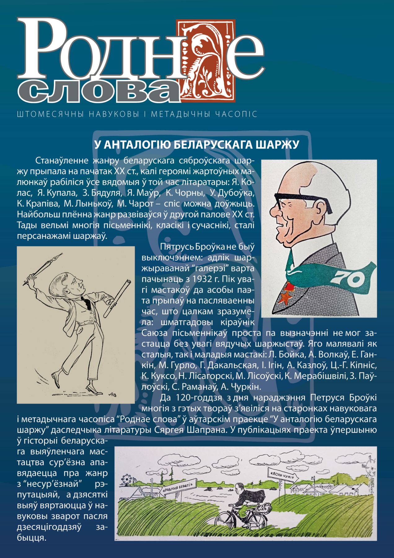 Гэта чарговы супольны праект часопіса “Роднае слова”, ажыццёўлены ў межах аўтарскага цыкла “У анталогію беларускага шаржу”. На гэты раз упершыню ў музейнай прасторы будзе прадстаўлена “галерэя” сяброўскіх шаржаў на Петруся Броўку, які ніколі не заставаўся без увагі вядучых мастакоў. Жартоўныя партрэты пісьменніка стваралі як вядомыя, так і маладыя аўтары, а самыя раннія выявы датуюцца 1930-мі гг.